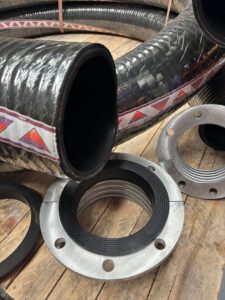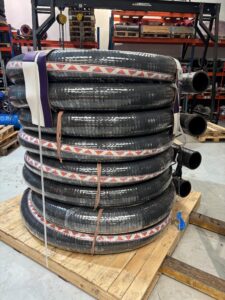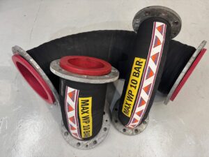 - Hoses – Size 100 to 250mm Manufactured as hardwall, corrugated cover, plain ends, 10m long, black natural rubber liner. Cut hose to suit, fit split cast aluminium PN10 couplings/ clamps and taper gaskets. WP10bar, SF3:1.