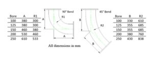- Bends – Size 100 to 250mm bore 90° & 45° bends for use where a much sharper bend is required than can be obtained using hoses. Manufactured as hardwall, smooth cover, red natural rubber liner and fitted with steel PN10 galvanised swivel flanges. WP10bar, SF3:1.